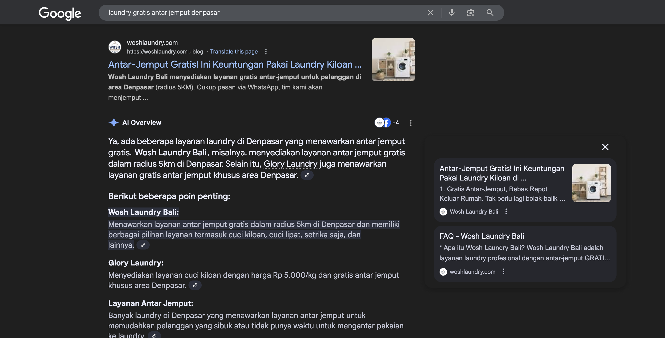 Bahkan Saking Optimalnya SEO dari Website, AI dari Google pun Juga Merekomendasikan Website dari Woshlaundry ini